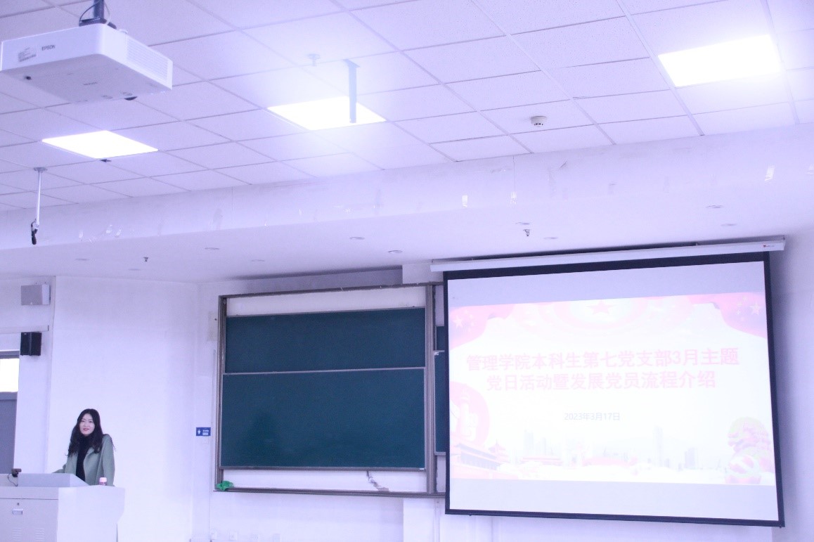 3月17日下午,管理学院本科生第七党支部在天山堂C203开展了3月份的主题党日活动。本次活动主题为“发展党员流程介绍”,本次会议由支部书记雷杰妮同志主持,支部全体成员参加。