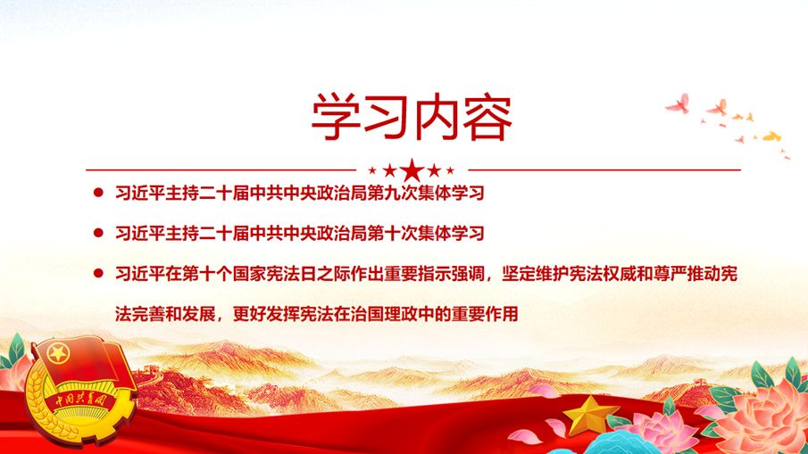 在第一部分理论学习中,同学们持续深入学习了习近平总书记主持二十届中共中央政治局第九次集体学习、习近平总书记主持二十届中共中央政治局第十次集体学习、习近平总书记在第十个国家宪法日之际作出重要指示强调,坚定维护宪法权威和尊严推动宪法完善和发展,更好发挥宪法在治国理政中的重要作用。