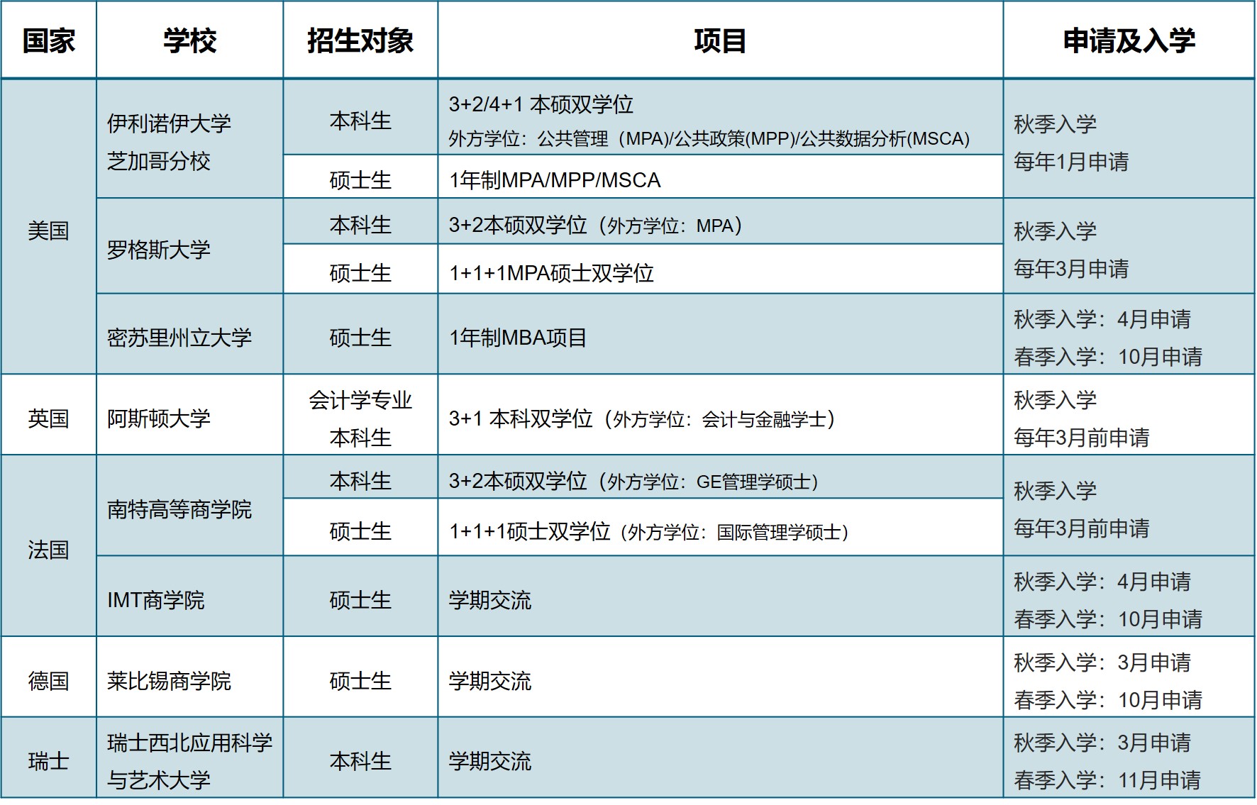 主要院际学期交流及学位项目