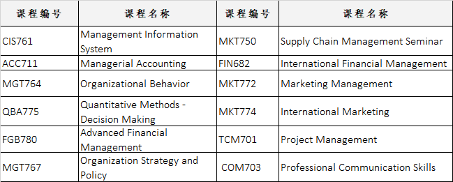 项目采用美国大学商学院的核心课程,采用美大学同期工商管理硕士学位课程的教学计划、教学方法、教材及教学管理模式。课程全部由资深教授主讲,各门课程给分主要采用课堂小考、期中和期末考试,以及部分小组讨论完成指定论文的方式。