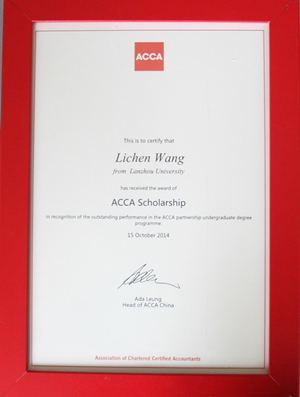 为鼓励全日制ACCA(英国特许公认会计师公会)方向班学生勤奋学习,ACCA在中国设立了ACCA优秀学生奖学金,根据ACCA官方的《ACCA优秀学生奖学金评定办法》和《兰州大学管理学院ACCA优秀学生奖学金评定办法》,我院2013级会计学专业ACCA方向班王力琛同学荣获2014年ACCA优秀学生奖学金。王力琛同学在校期间学习成绩优异,成绩排名班级第一, ACCA课程F1,F2,F3校考均在90分以上。