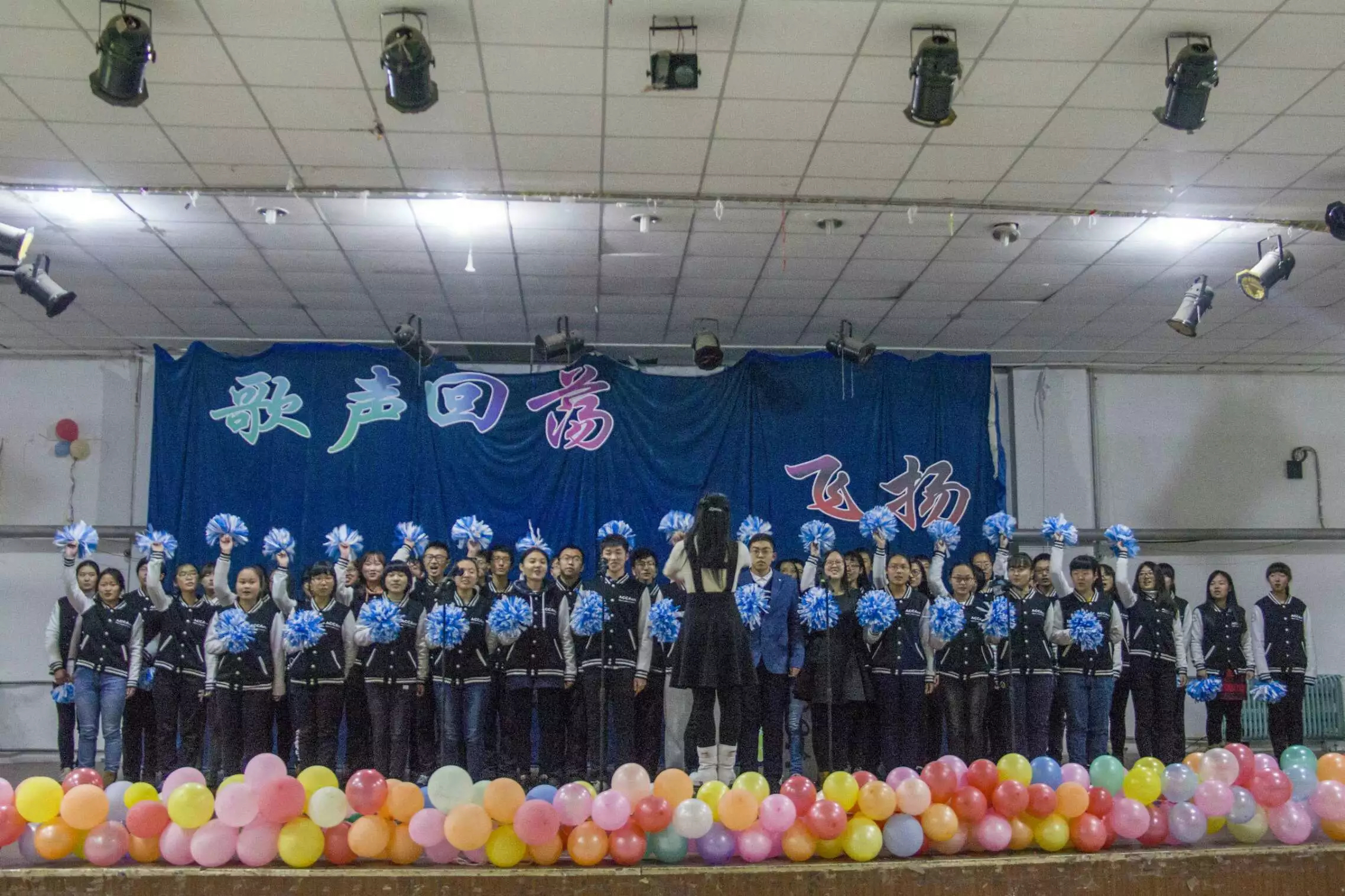 登场了,三排队列依次有序上台,没有发出一点杂音。在靳逸文、邹德乾两位同学一段精彩的朗诵后,《相亲相爱》的曲目缓缓响起。合唱的指挥何淼同学随着调子打着节拍,引导同学入歌。“天下相亲与相爱,动身千里外,心自成一脉。”伴随着第一排同学们挥舞的彩球,嘹亮整齐的歌声响起。歌词经过巧妙的改编,将兰大文化、管院特色和ACCA同学们对班集体的有机结合在一起,早已被同学们熟记于心。与欢快的曲调合奏的,是同学们热情洋溢的心。无论是全班合唱还是男女分部的互唱都与同学们手中的花环一道,深深感染了台下的评委老师和同学们。这欢乐的5分钟似乎过得很快,聆听者们意犹未竟,而全体ACCA同学们那一齐有力的“ACCA,永不分离”的呼号也表达了他们对班集体的融入和热爱。