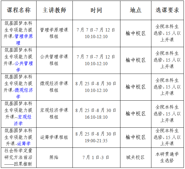 学生须参加“学生专项能力提升”7项内容中任意一项,2025年7月6日前须通过问卷提交暑期学校参与意向。2025年秋季学期第二周之前提交《管理学院2025年暑期学校培训证明》各班学委处,学委收齐后报院办将军院3号楼307办公室。