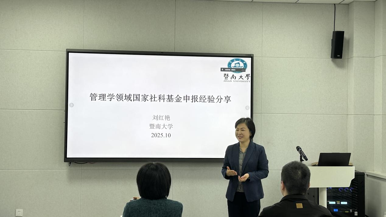 2025年10月26上午,兰州大学管理学院数字营销管理研究所成功举办第六期学术研讨会。会议以“管理学领域国家社科基金项目的申报经验”为主题,由柳武妹教授主持,邀请了暨南大学管理学院刘红艳副教授带来学术报告。学院多位教师和学生积极参与,现场反响热烈。