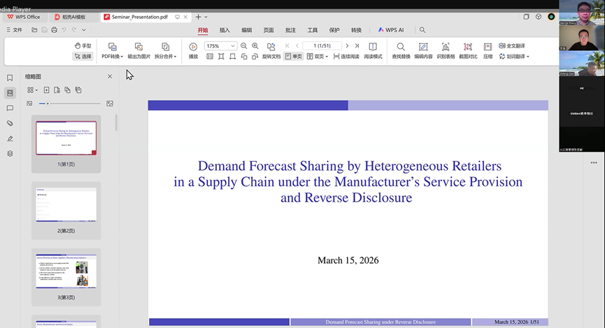2026年3月16日,『管理决策与数据科学研究团队』系列研讨会第五十八期以Zoom线上会议的形式顺利举行。本次研讨会由钱志峰青年研究员主持,豆垒博士生进行了题为“制造商服务提供与反向信息披露下的异质零售商需求信息共享研究(Demand forecast sharing by heterogeneous retailers in a supply chain under the manufacturer's service provision and reverse-disclosure)”的分享,学院师生共60余人参加了此次研讨会。