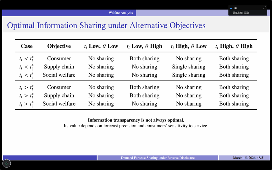 研究表明,当仅有一家零售商共享需求信息时,制造商是否选择反向披露取决于共享信息的精度,只有当信息精度足够高时,反向披露才更有利于制造商;而当双方零售商均进行信息共享时,制造商总是倾向于进行反向披露。进一步地,尽管反向披露会削弱零售商原有的信息优势,但在消费者对服务较为敏感的情况下,零售商仍可能因服务响应能力提升带来的收益而选择自愿共享信息。报告还进一步比较了不同信息状态下的消费者剩余、供应链总利润与社会福利,揭示了信息完全透明并非在任何条件下都是最优的,其效果取决于需求预测信息质量与消费者服务敏感度的共同作用。