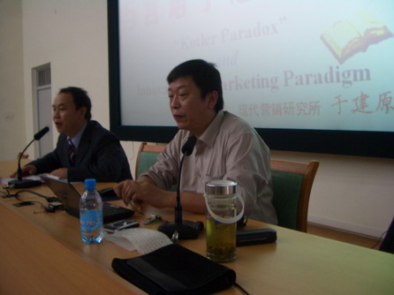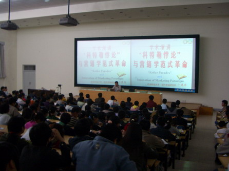 于教授致力于研究市场营销的理论与方法,因些他的报告也紧紧围绕营销学展开。本次学术演讲的主题是“科特勒悖论与营销学范式革命”。他首先向同学们介绍了营销学的渊源,指出中国营销学的研究背景是管理营销学。揭示了营销学中的Kotler营销悖论。然后具体阐述了营销学范式革命,提出“关系营销”和“反应营销”模式,并以宝洁公司、戴尔公司的商业模型与IBM公司作比较。联系我国实际以海尔集团打造世界名牌之路为例,作出了更进一步的探讨和论述,提出营销在企业发展中的重要作用,企业的营销系统应该依据于顾客需要,满足顾客的个性化选择。于教授还谈到,反应营销是完整的后工业社会化生产方式,也为人类追求建立更为和谐的上层建筑提供了现实经济基础。