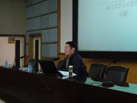 管理学院学术活动月依旧如火如荼地进行着。2006年9月27日晚第四场讲座,厦门大学卓越教授的《政府职能管理与政府管理创新》在教学楼C302开场。本次报告会由管理学院副院长沙勇忠副教授主持,与会的还有管理学院团委副书记许希辉、王西文老师,部分研究生和本科生也聆听了报告会。