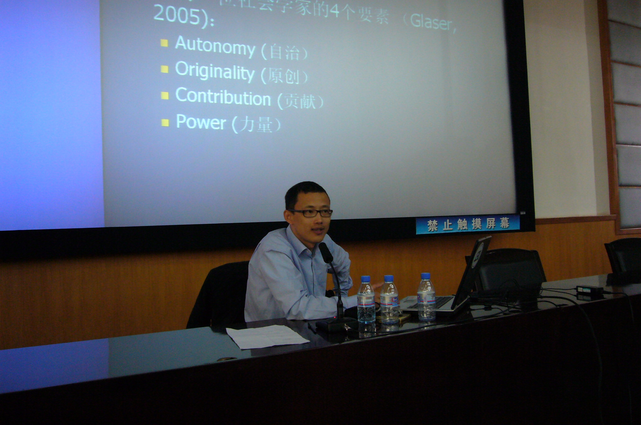费博士一改往常报告会惯例,一开始就采用互相问答的方式,鼓励同学们积极提问,这使同学们很快融入到报告会当中,创造了一种轻松活跃的气氛。针对同学们的提问,费博士向同学们谈了他自己对于“理论与实践的关系” 、“中国教育与国外教育的差别”、 “中国国际地位” 、“经济全球化背景下的文化冲突”等问题的深刻独到的见解,之后费博士还详细的介绍了他致力研究的扎根理论研究方法及其创始人格拉斯(Dr Barney Glaser)的基本情况。