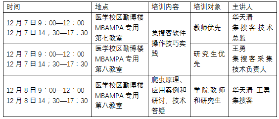 学院购买的集搜客网页抓取软件培训将于12月7日和8日(本周四、周五)在医学校区勤博楼第七教室和第八教室同时进行,经前期向全院老师调研初步统计,预计参加培训的教师大约20名,学生120名左右,请参加培训的老师学生自带笔记本电脑。