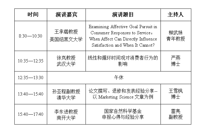 兰州大学管理学院将于2018年10月29日举行“市场营销与消费者行为第五期前沿学术论坛”。应服务管理研究所柳武妹青年教授的邀请,美国纽黑文大学的王承璐教授、南开大学的李东进教授、武汉大学的徐岚教授和清华大学的孙亚程副教授将向兰大师生做四场精彩讲座。这些学者已在国内或国际市场营销权威和顶级刊物中发表大量高水平研究成果。在本次学术讲座中,这些学者会从研究想法的提出、研究过程的开展、研究论文的撰写与修改,以及论文的投稿、退修和发表等方面,分享自己的学术研究与经验。除此之外,他们还会分享国家自然科学基金的申报经验与心得。此次学术论坛既是一次学术盛宴,也是一次不可多得的学习机会。欢迎感兴趣的师生积极参加!