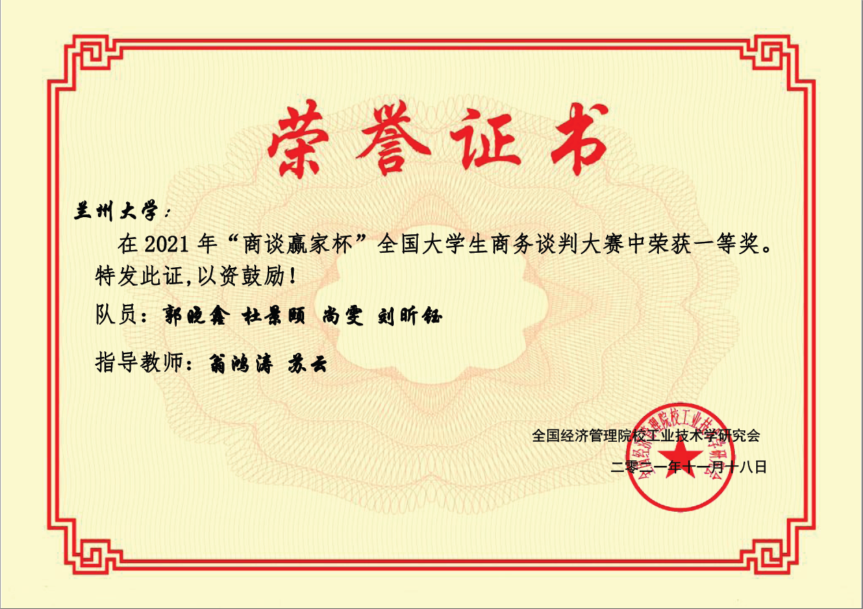 2021年11月19日,由全国经济管理院校工业技术学研究会沟通与谈判委员会主办、江西财经大学工商管理学院承办、有道商创(深圳)科技有限公司提供技术支持的2021年“商谈赢家杯”全国大学生商务谈判大赛结果公布。由翁鸿涛、苏云、李一男和李世勇4名教师指导的8支队伍斩获一等奖一项,二等奖6项,郭晓鑫、李玉洁同学获得“优秀谈判手”称号。同时鉴于兰州大学近三年参赛的优异成绩和表现,组委会为我校颁发优秀组织奖。