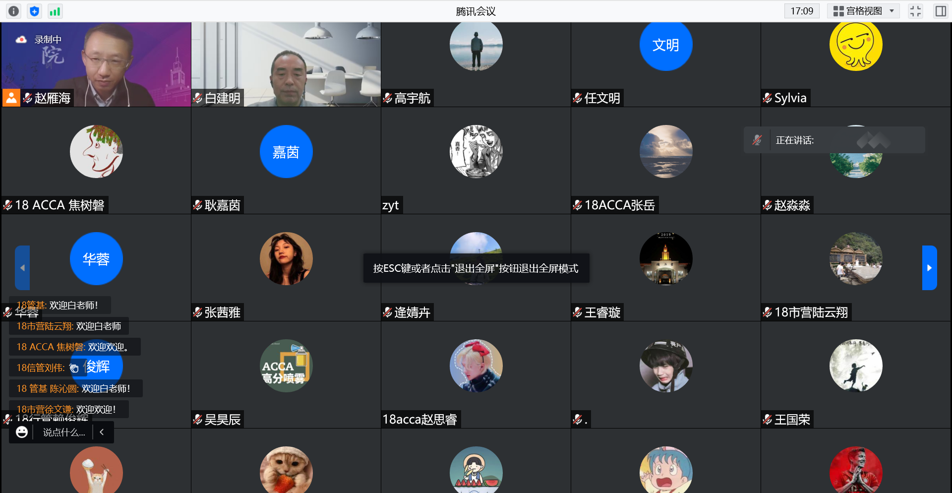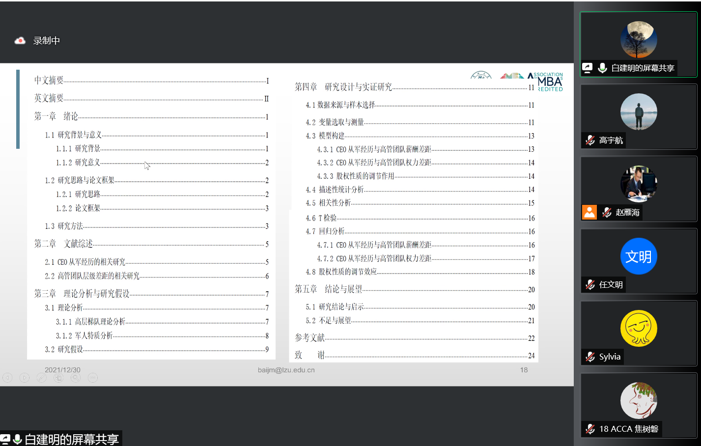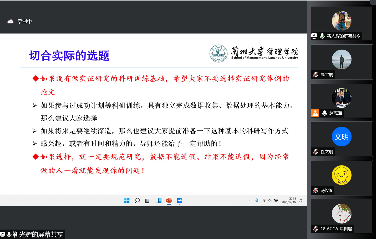 为帮助2018级同学准备毕业论文开题、整合相关专业知识、树立严谨科学的论文写作态度、提升毕业论文写作质量,2021年12月30日晚上,管理学院教学副院长赵雁海老师、历年本科毕业论文优秀指导教师管理学系白建明老师、会计学系靳光辉老师、公共管理学系孙斐老师应邀进行了线上毕业论文选题与写作指导讲座,此次讲座针对2018级本科生,共有170余人学生在线听讲。