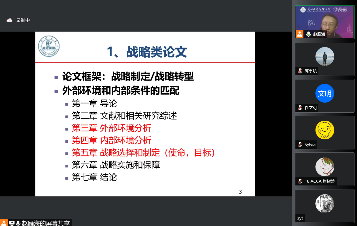赵雁海老师也针对人力资源和市场营销方面的论文,对各个方向论文的写作类型和框架进行了介绍,还从标题、技术路线、数据分析、表格制图等论文写作细节等多个方面进行了讲解。同时赵老师还要求同学们要在阅读经典文献中发掘问题、思考问题,培养起独立分析、解决问题的能力,在论文写作中做好扎实的文献基础,发挥外语优势,阅读外文文献,多维度构建框架体系。建议毕业生能够合理利用假期时间,开展论文写作。