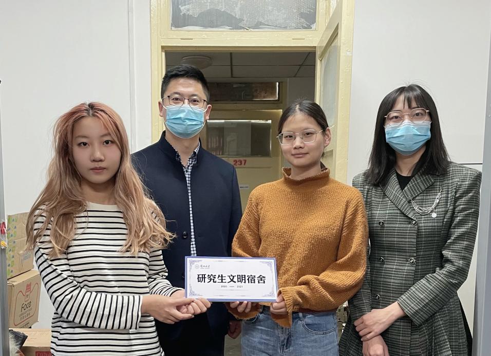 常韬和雷宇为城关校区西区12号公寓楼214房间、218房间、219房间三个校级“文明宿舍”挂牌,希望宿舍成员以此为激励,在未来的学习生活中继续努力,带动广大同学向优秀看齐,展现优秀研究生文明宿舍风采,争做全面发展的时代新人。