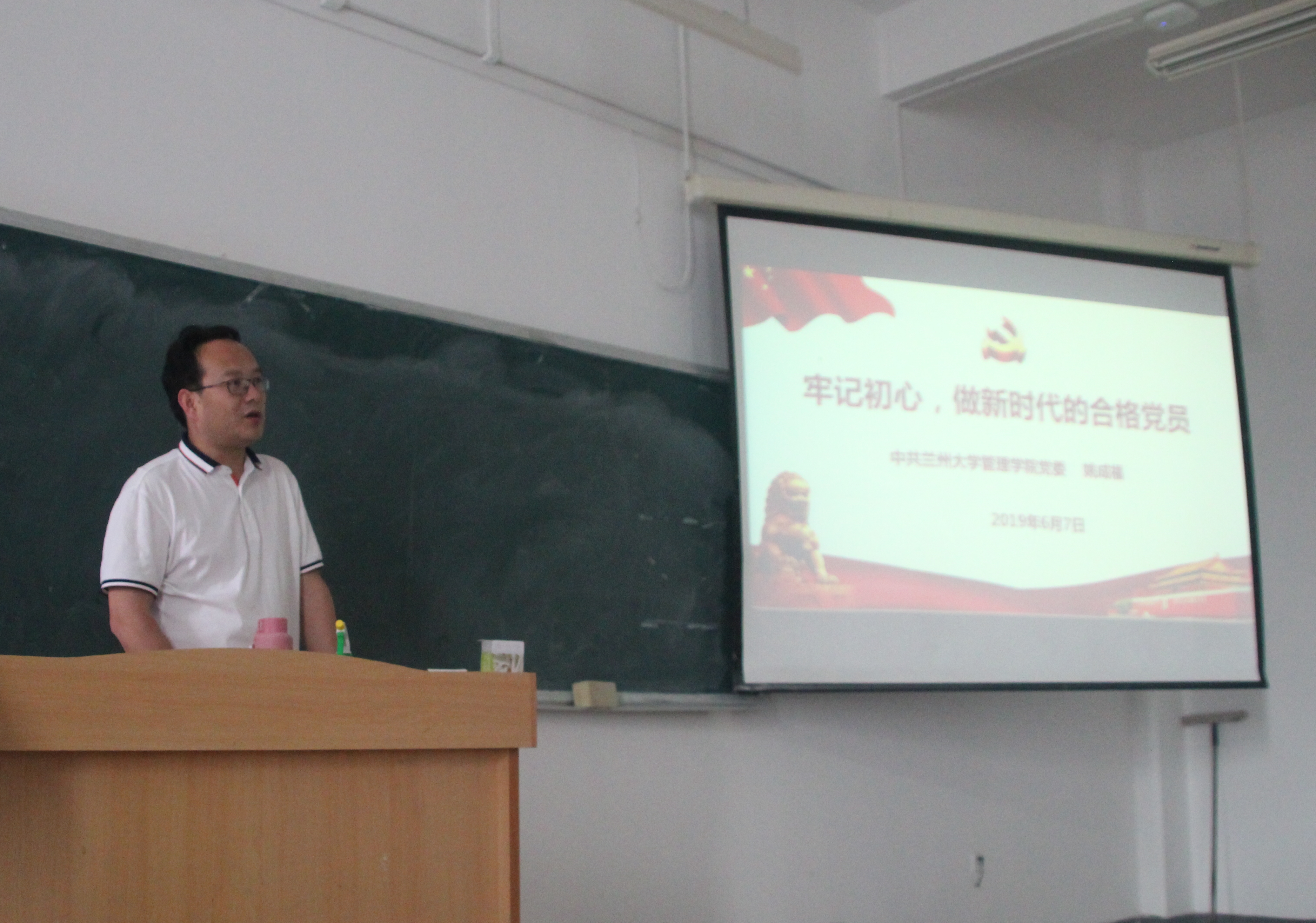 下午,在榆中校区天山堂B102开展了集中学习环节。管理学院党委书记姚成福为同学们上了一堂“牢记初心,做新时代合格党员”的主题党课。他从中国共产党的初心内涵、为什么要不忘初心、如何不忘初心三个方面展开,深入浅出的论述了在新时代如何做一名合格的大学生党员,向同学们提出了殷切的希望。