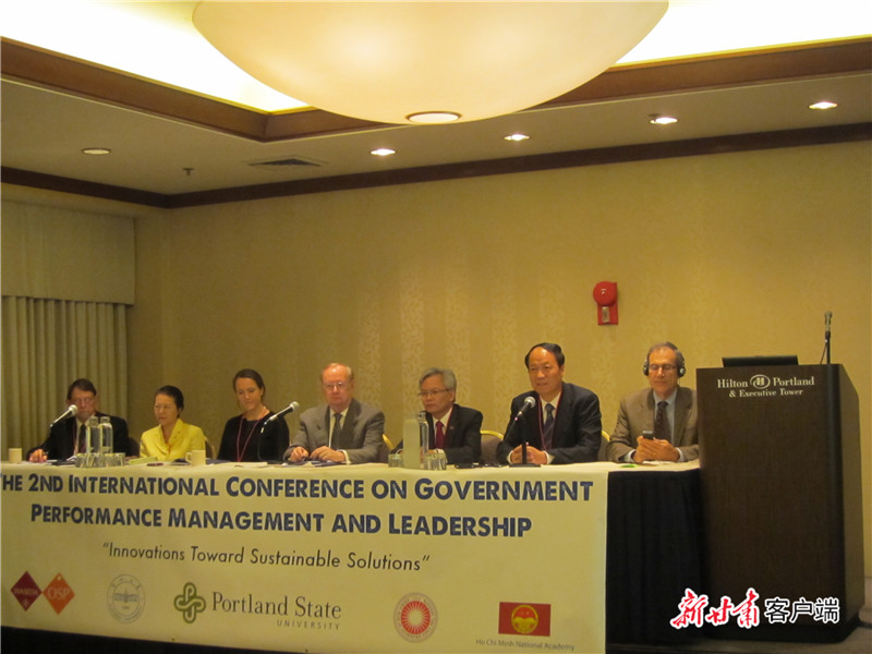 包国宪(右二)在美国波特兰州立大学举行的“第二届政府绩效管理与绩效领导国际学术会议”上发言。