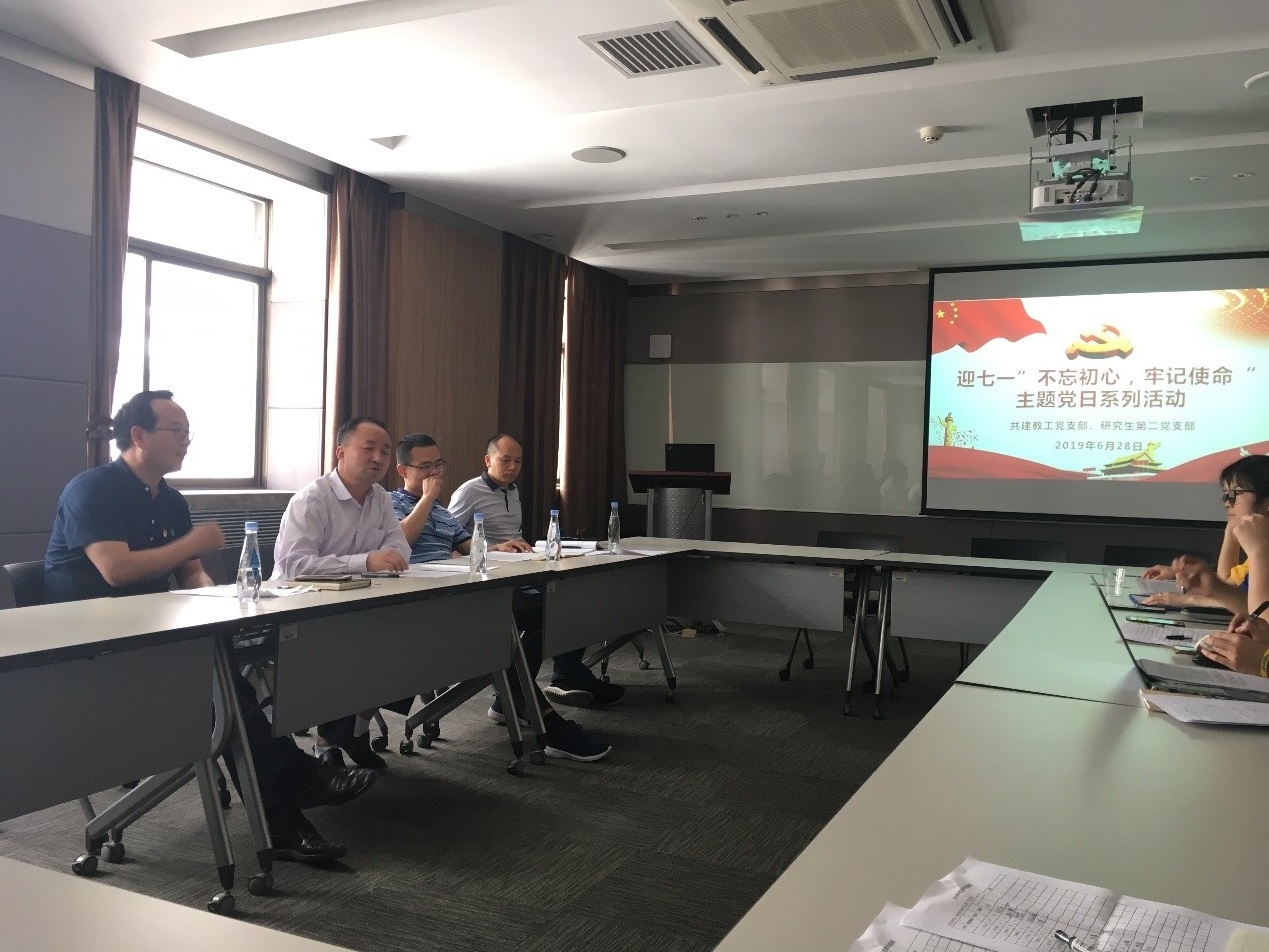 在学习会上,党员认真观看了习近平总书记5月31日在中央“不忘初心、牢记使命”主题教育工作会议上讲话的新闻报道视频,姚成福与教工第二党支部支部书记焦克源对总书记5月31日在中央“不忘初心、牢记使命”主题教育工作会议上的重要讲话精神和《中共中央关于在全党开展“不忘初心、牢记使命”主题教育的意见》进行讲解。姚成福强调,党员作为9000万分之一要在不同的岗位上努力做到为中国人民谋幸福,要在平时的学习与工作中找差距,他详细阐述了对支委工作的要求和全体党员同志的学习要求;焦克源从“主题教育活动的重要性”、“我们该如何做好主题教育活动”等方面做了重要补充;教工党支部、学生党支部党员代表依次从不同角度发表了对于讲话精神的学习心得。