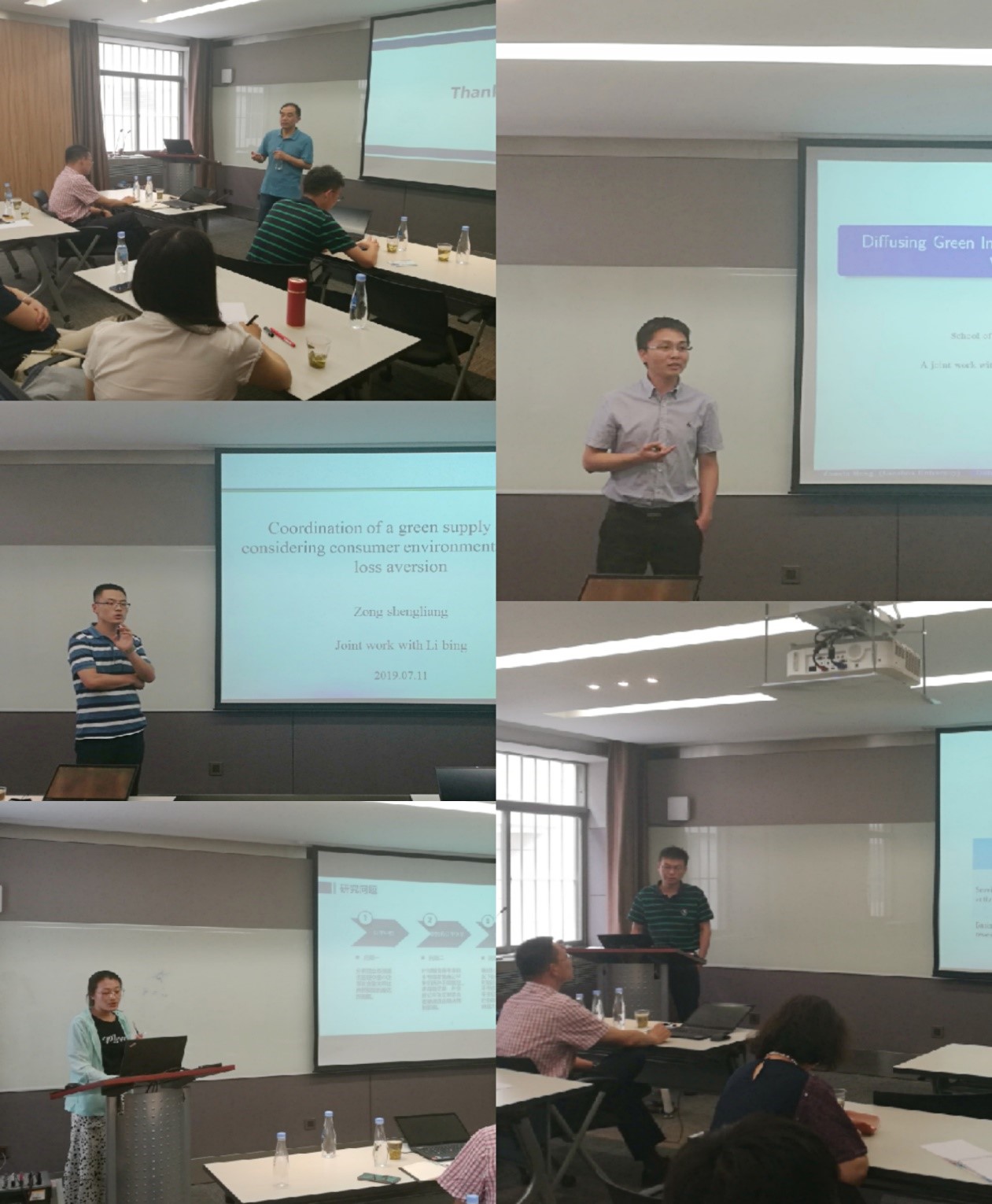 首先,管理学院教授白建明分享了他的最新研究《Fraudulent claims detection in China auto insurance market based on multiple data methods》。该研究通过估计我国保险公司的欺诈率,对保险欺诈问题进行了分析和探讨。之后,管理学院青年教授王康周带来了《Servitization business model’s entry in the traditional sales market》的汇报,他为大家介绍了完全垄断与不完全垄断情境下服务共享在传统市场中的影响。随后进行分享的是宗胜亮副教授与洪兆富副教授,他们分别带来了《Coordination of a green supply chain considering consumer environmental quality loss aversion》和《Diffusion green innovations in social networks via word of mouth》的研究。这两项研究从不同的角度分析了绿色供应链以及绿色产品的相关问题。最后一位分享人是来自企业管理专业的硕士研究生张伟荷,她分享的题目是《公平关切下的混合双渠道供应链定价与协调研究》。
