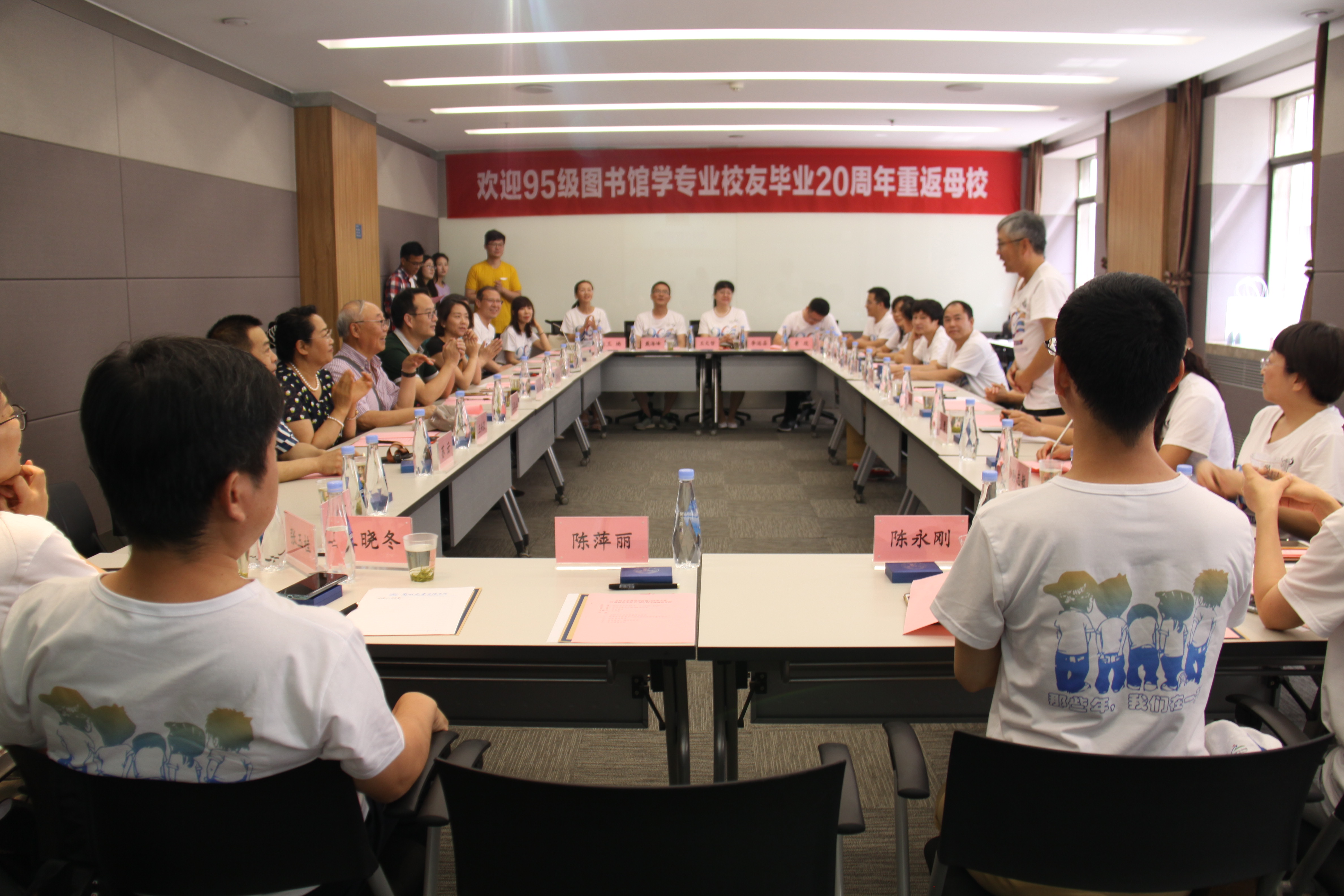 7月28日上午,管理学院1995级图书馆学专业28名校友毕业20周年之际重返母校,参加了学校组织的校友返校系列活动,并在齐云楼204会议室召开了师生座谈会。管理学院党委书记姚成福、副书记李艳霞,时任教师王桂忠、王汉杰、李映洲、王兴泉、苏云应邀参加了座谈会。与会校友回顾了20年来的人生历程,师生之间畅叙情谊,整场座谈会气氛热烈。