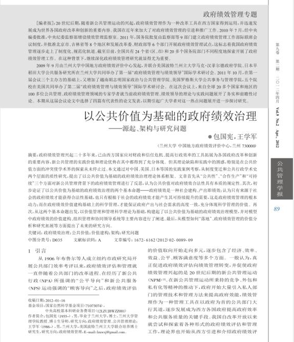包国宪教授和王学军教授的论文《以公共价值为基础的政府绩效治理——源起、架构与研究问题》发表在杂志2012年第2期,论文开创性地提出了以公共价值为基础的政府绩效治理理论体系框架,目前已被引265次,在《公共管理学报》创刊以来刊登的论文中被引数量位居第2位。论文发表后被2012年第15期《新华文摘》全文转载,2012年第8期人大复印资料《公共行政》全文转载,2012年第3期人大复印资料《政治学文摘》转载,并先后获得甘肃省第十三次哲学社会科学优秀成果一等奖和第七届高等学校科学研究优秀成果奖(人文社会科学)二等奖。