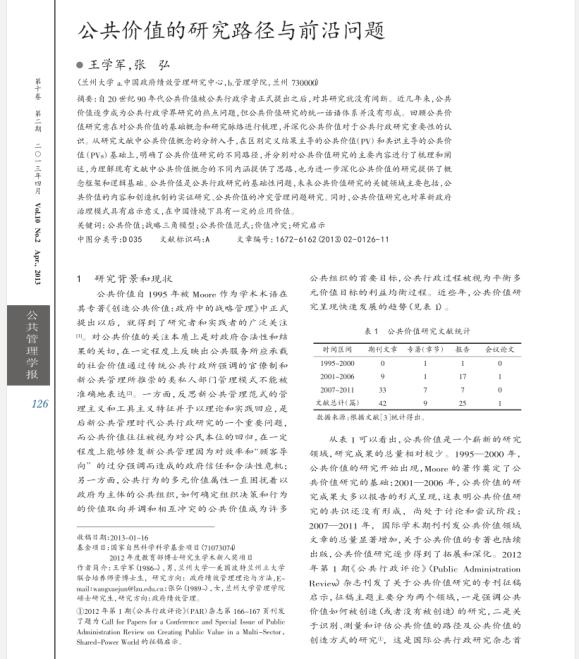 王学军教授和博士生张弘的论文《公共价值的研究路径与前沿问题》发表在杂志2013年第2期,论文在区别结果主导与共识主导的公共价值概念基础上,提出了公共价值研究的不同路径,目前已被引130次,在《公共管理学报》创刊以来刊登的论文中被引数量位居第15位。论文发表后被2013年第8期人大复印资料《公共行政》全文转载。