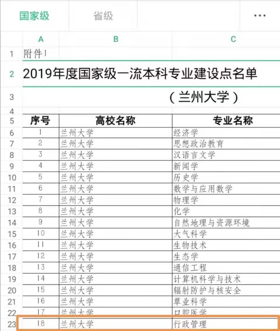 2019年12月30日,教育部办公厅公布了2019年度国家级和省级一流本科专业建设点名单,兰州大学共有18个本科专业入选国家级一流本科专业建设点,20个本科专业入选省级一流本科专业建设点。其中,我院行政管理专业入选国家级一流本科专业建设点,会计学、市场营销、人力资源管理专业入选省级一流本科专业建设点,入选数量位居全校第一名。