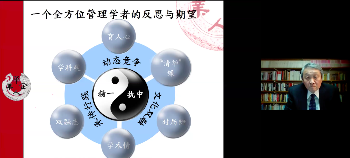 美国弗吉尼亚大学达顿商学院陈明哲教授做了题为“承传行践:全方位管理学者的淬炼”的主题发言。陈教授首先分享了自己对管理研究“道”和“术”的看法,然后从育人心、清华缘、时局辨、学术情、双融志、学科观六个方面详细介绍了一名全方位管理学者的淬炼历程,且“精一双融”的理念始终贯穿在这一历程中。陈教授认为中国管理学者应当扮演起“士”的角色,将中国管理研究与实务结合起来,真正推动中国管理学科的发展。最后,陈教授对中国管理学者交流营提出几点期许,希望中国管理学者交流营成为培育研究与教学合一、双融学术与实务之全方位管理学者的平台、连接中西管理学术与学者的桥梁、中国管理学者的家园、导正管理学风的明灯。在演讲过程中,即使有时差因素,陈教授一直坚持到深夜并完成主题演讲的所有内容,同大家的互动使得线上会议精彩纷呈。
