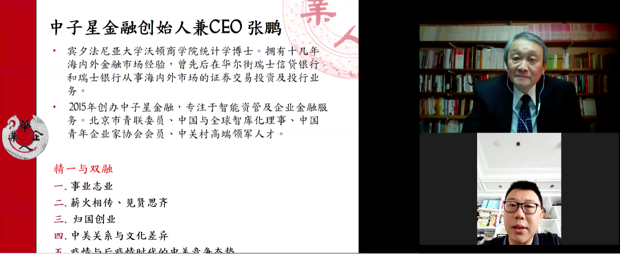 5号上午,陈明哲教授对中子星金融创始人兼CEO张鹏进行了深入访谈,话题包括事业志业、中国新企业家的特点、归国创业经历、中美关系与文化差异、疫情与后疫情时代的中美竞争态势。张鹏首先介绍了自己的创业经历和中子星金融,然后介绍了中美企业与企业家的差别、中国企业家的特质,指出中国青年企业家脚踏实地、自信的特质,而老一辈企业家更具备朴素的奉献精神。访谈中,张鹏认为回国创业是自己最引以为傲的事,陈教授表示张鹏是年轻企业家的代表,是很好的“承传”典范。