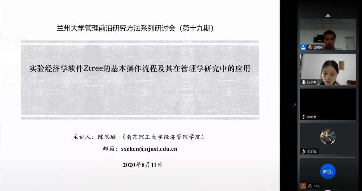 2020年8月11日下午,管理前沿研究方法系列研讨会(第十九期)以腾讯会议的形式顺利举行。应战略与组织管理研究所卫旭华教授邀请,南京理工大学经济管理学院讲师陈思璇博士开展了以“实验经济学软件Ztree的基本操作流程及其在管理学研究中的应用”的讲座,来自兰州大学、浙江大学、哈尔滨工业大学、中南大学、天津大学、东北大学等高校的130余名师生参加了此次在线讲座。