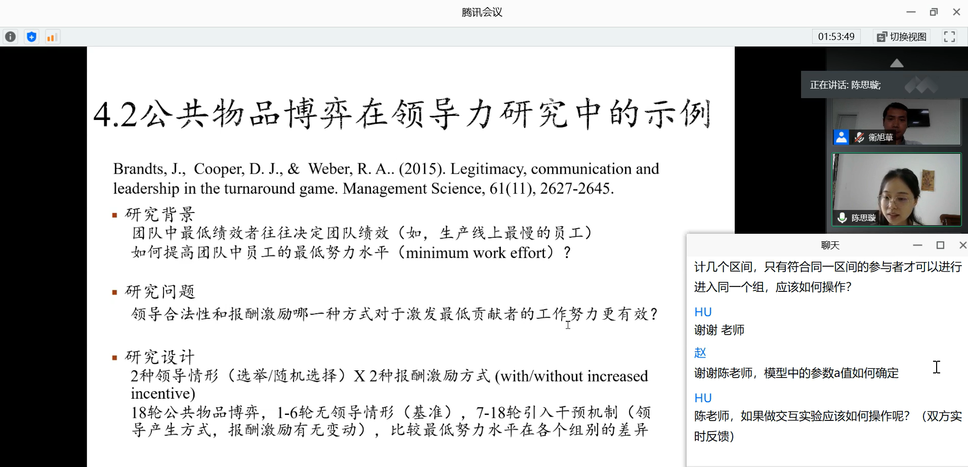 最后,陈老师结合自己在领导力研究方面的积累,以具体研究为例,结合Brandts等学者在2015年在《Management Science》上发表的Legitimacy, communication and leadership in the turnaround game一文,向我们介绍了Ztree在管理学中的应用,并在讲座的最后指出结合Ztree等实验经济学工具进行领导力研究是进一步加强科学性的有效途径。