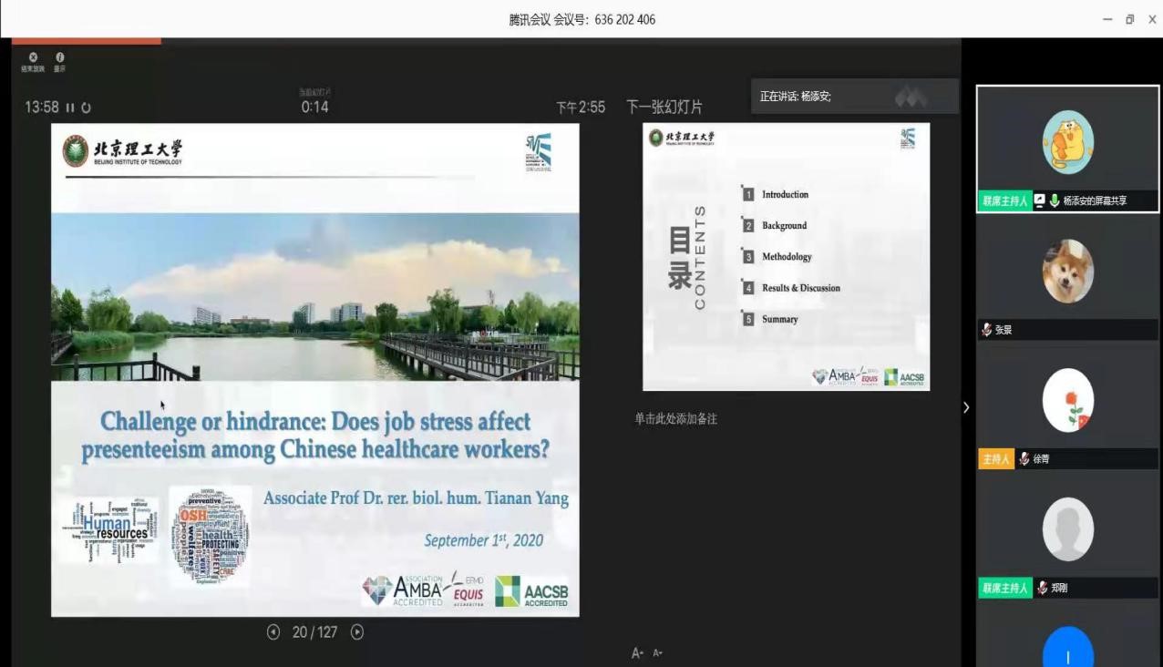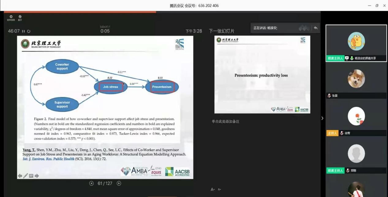 9月1日下午,应兰州大学管理学院工商管理系系主任郑刚博士邀请,北京理工大学管理与经济学院组织与人力资源系杨添安副教授做客雏鹰大讲堂,通过腾讯会议平台为我院师生做了主题为“工作压力是否影响中国医护人员的出勤?”的线上学术讲座。本次讲座由郑刚老师主持。院内外200余名师生通过腾讯视频会议和直播平台在线参加了讲座。