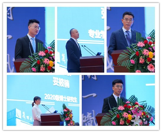 在校生代表2018级汤卫国、张永康,新生代表妥筱楠、刘艳平、冉博文依次在典礼上做了发言。
