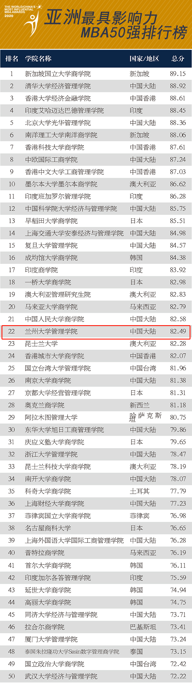 《世界企业家》今年继续发布2020年“亚洲最具影响力MBA50强”排行榜,共涵盖了亚洲15个国家和地区,其中,兰州大学管理学院位居第22名。
