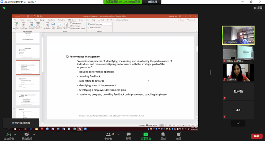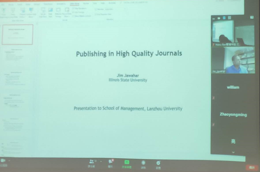 2020年9月28日,公共管理前沿问题方法研讨会(第33期)以ZOOM会议的形式顺利举行。应中国政府绩效管理研究中心保海旭副教授邀请,Career Development International期刊主编、伊利诺伊州立大学管理与定量方法系教授I.M.Jawahar为兰州大学的师生带来以“发表高质量期刊文章”、“公私部门绩效管理”为主题的两场讲座,共有80余名师生在线收听,部分师生在齐云楼204集体收听。