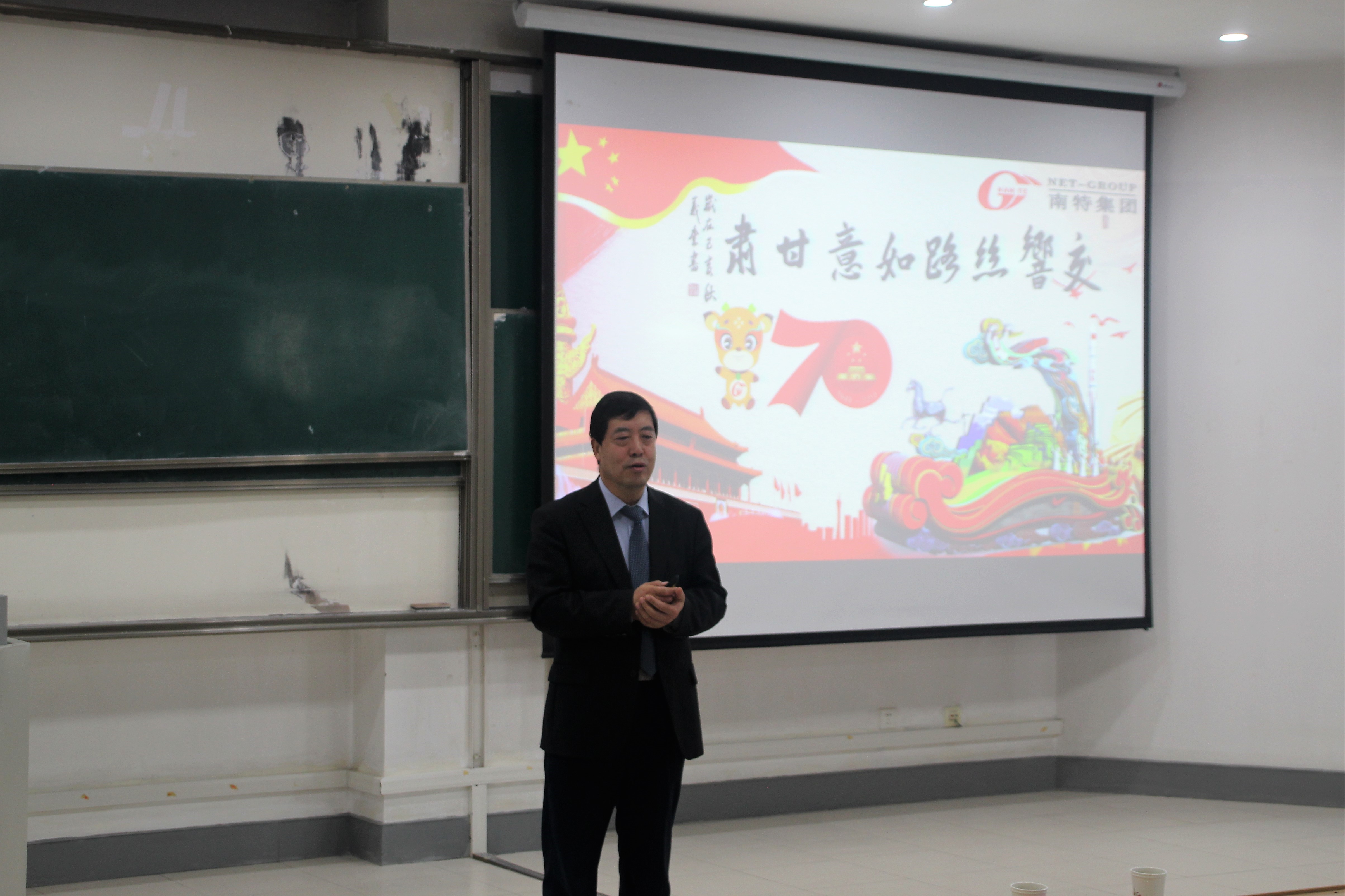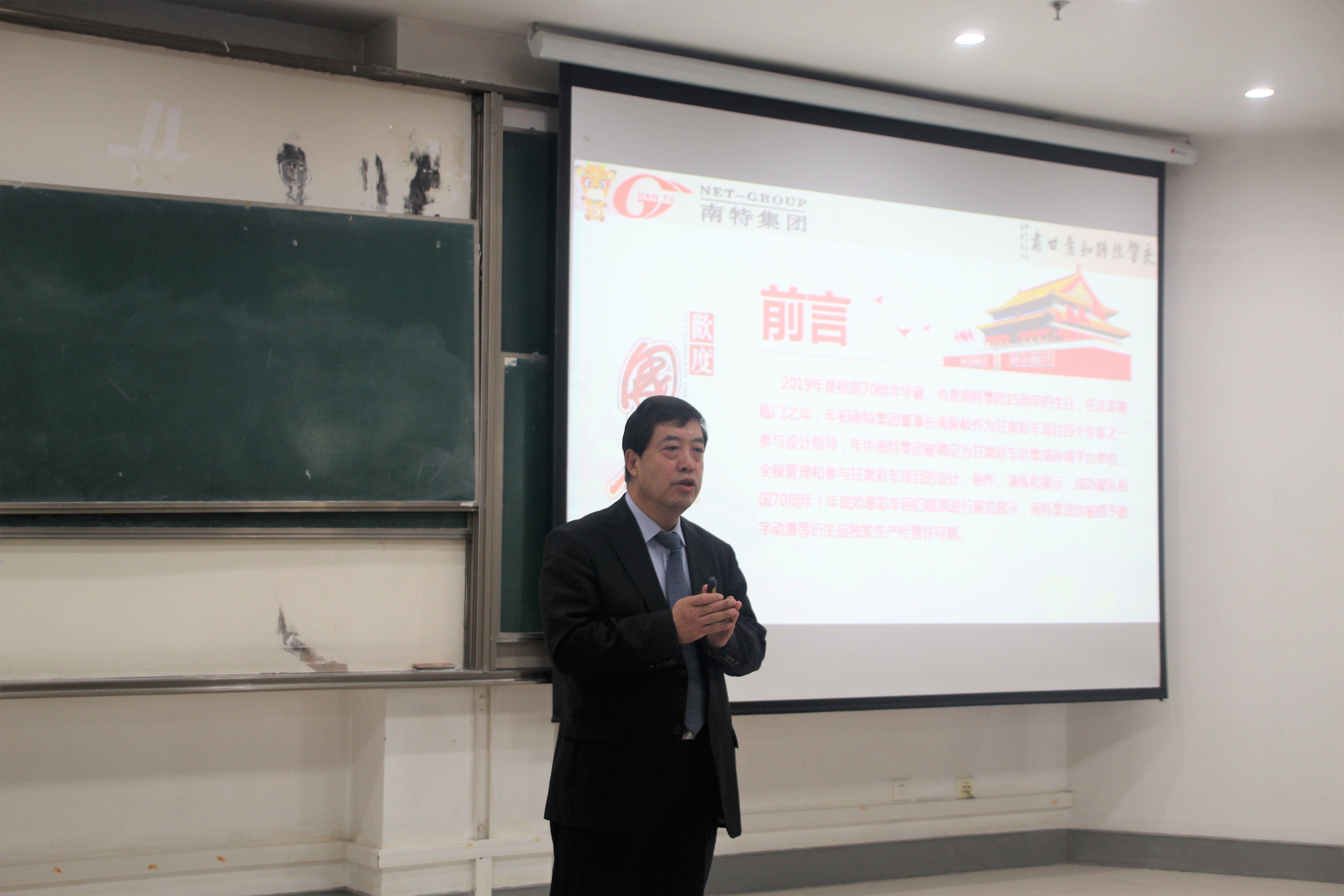 讲座伊始,南振岐校友通过播放宣传片总体介绍了南特数码科技集团的公司概况、公司文化及主要产品。随后,他围绕着“盛世中国,喜迎华诞”、“锐意创新,礼赞陇原”、“调查考察,集结精英”、“精良制作,秉承匠心”等十个关键词句,细致入微地介绍了南特数码科技集团与七十周年国庆大典上甘肃彩车之间的故事。他向同学们介绍了自己是如何受到邀请参与彩车制作,彩车的总体设计又是如何一步一步完善的,以及彩车完成展览后载誉归来促进甘肃地区文化发展的完整过程。