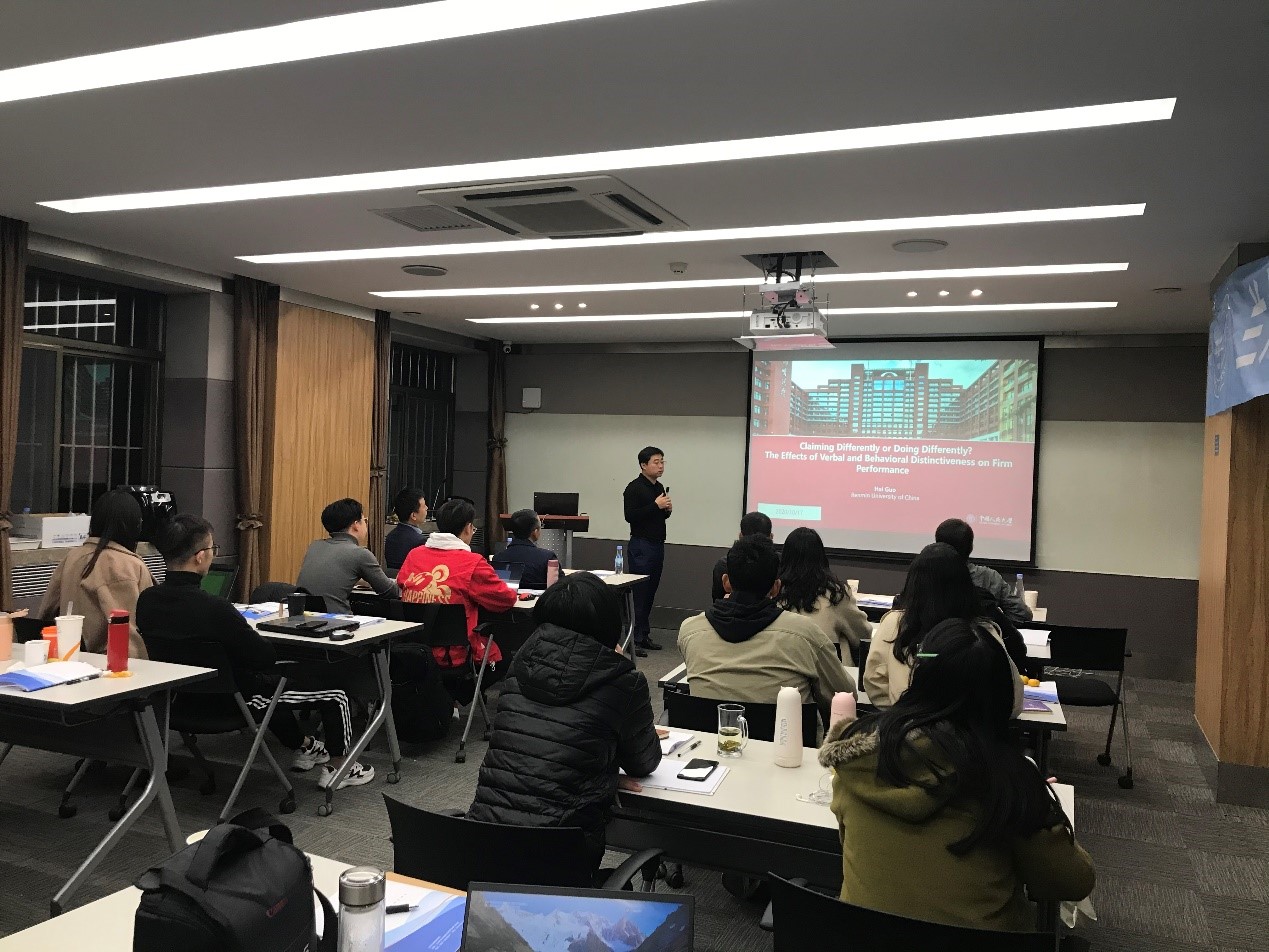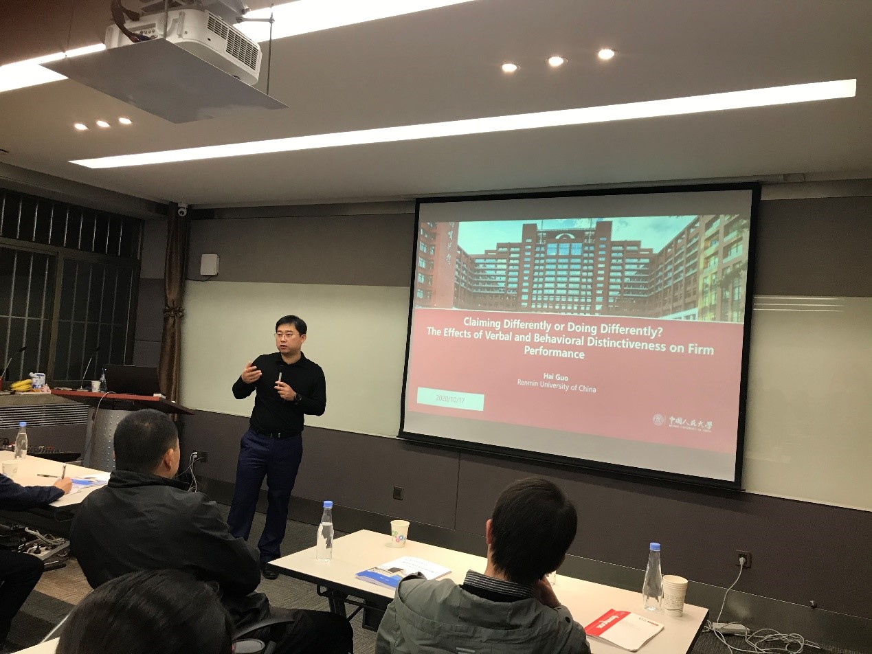 2020年10月17日,应可持续发展与环境管理研究所所长吴建祖教授邀请,中国人民大学商学院郭海教授来我院举办了以Claiming differently or doing differently: The impact of verbal and behavioral distinctiveness on firm performance为题的学术讲座,讲座由赵雁海副教授主持。