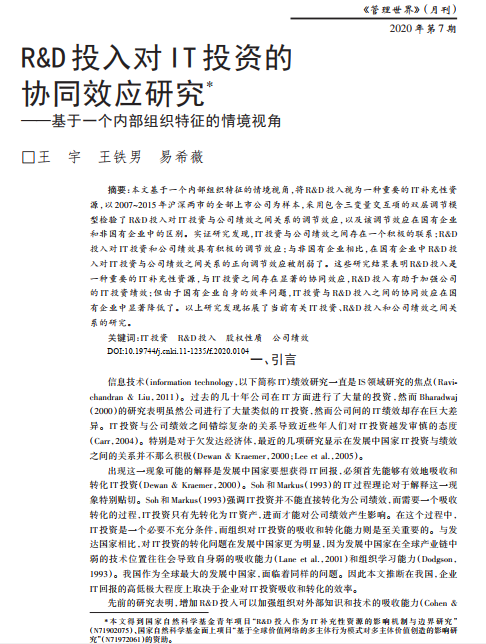 本研究基于一个IT与R&D协同的视角,探索了R&D投入在IT投资绩效中所扮演的角色,以及这一角色在国有企业和非国有企业中的不同。以2007—2015年我国沪深两市的上市公司为研究对象,采用包含三项交互项的双层调节固定效应模型检验了IT投资与公司绩效之间的关系、R&D投入对IT投资与公司绩效之间关系的调节效应以及该调节效应在国有企业和非国有企业之间的差别。