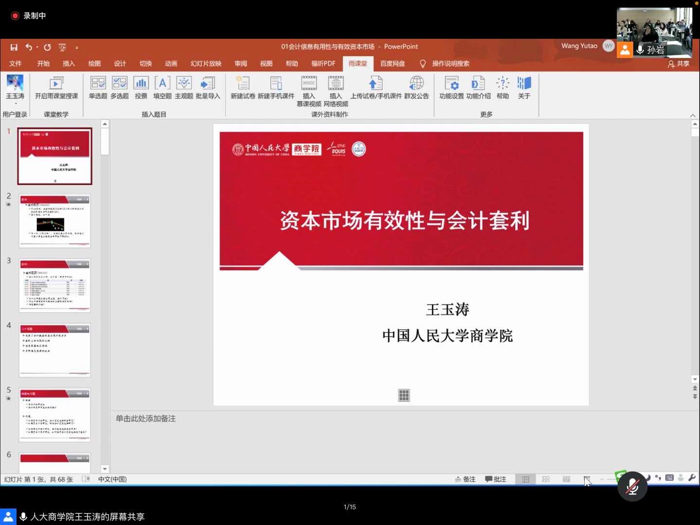 2020年10月28日上午,应管理学院运营与财务管理研究所孙岩教授邀请,中国人民大学商学院王玉涛教授为我院师生开展了以“资本市场有效性与会计套利”为主题的线上学术讲座,讲座由孙岩教授主持。