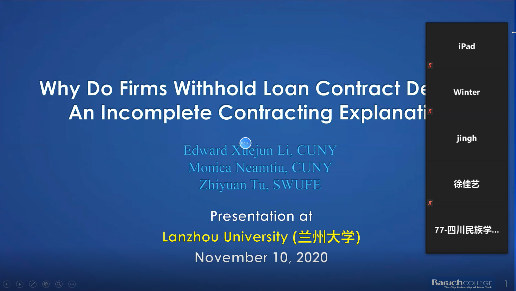 2020年11月10日上午,应管理学院运营与财务管理研究所罗劲博教授邀请,纽约城市大学李雪君教授以Zoom线上会议的形式开展了以“Why Do Firms Withhold Loan Contract Details? An Incomplete Contracting Explanation”为主题的学术讲座,讲座由罗劲博教授主持。