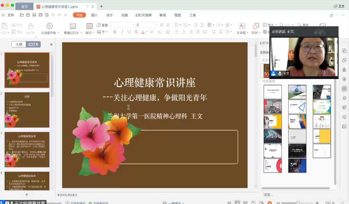 11月12日下午在城关校区东区勤博楼第二报告厅,11月19日下午通过腾讯会议平台,分别针对研究生和本科生开展了培训。王文老师以 “关注心理健康,争做阳光青年”为题,重点阐释了心理健康的10项标准,即具有充分的适应力;能充分地了解自己,并对自己的能力做出适度的评价;生活的目标切合实际;不脱离现实环境;能保持人格的完整与和谐;善于从经验中学习;能保持良好的人际关系;能适度地发泄情绪和控制情绪;在不违背集体利益的前提下,能有限度地发挥个性;不违背社会规范的前提下,能恰当地满足个人的基本需求等。并分析了不良心理产生的原因,介绍了自我调整和专业调适的途径和方法。最后,还科普了抑郁症的相关知识,引导同学们了解抑郁症的表现以及治疗方法,勉励同学们应对抑郁症要做到“及时察觉、正视疾病、正确治疗、调节心态、健康生活”。