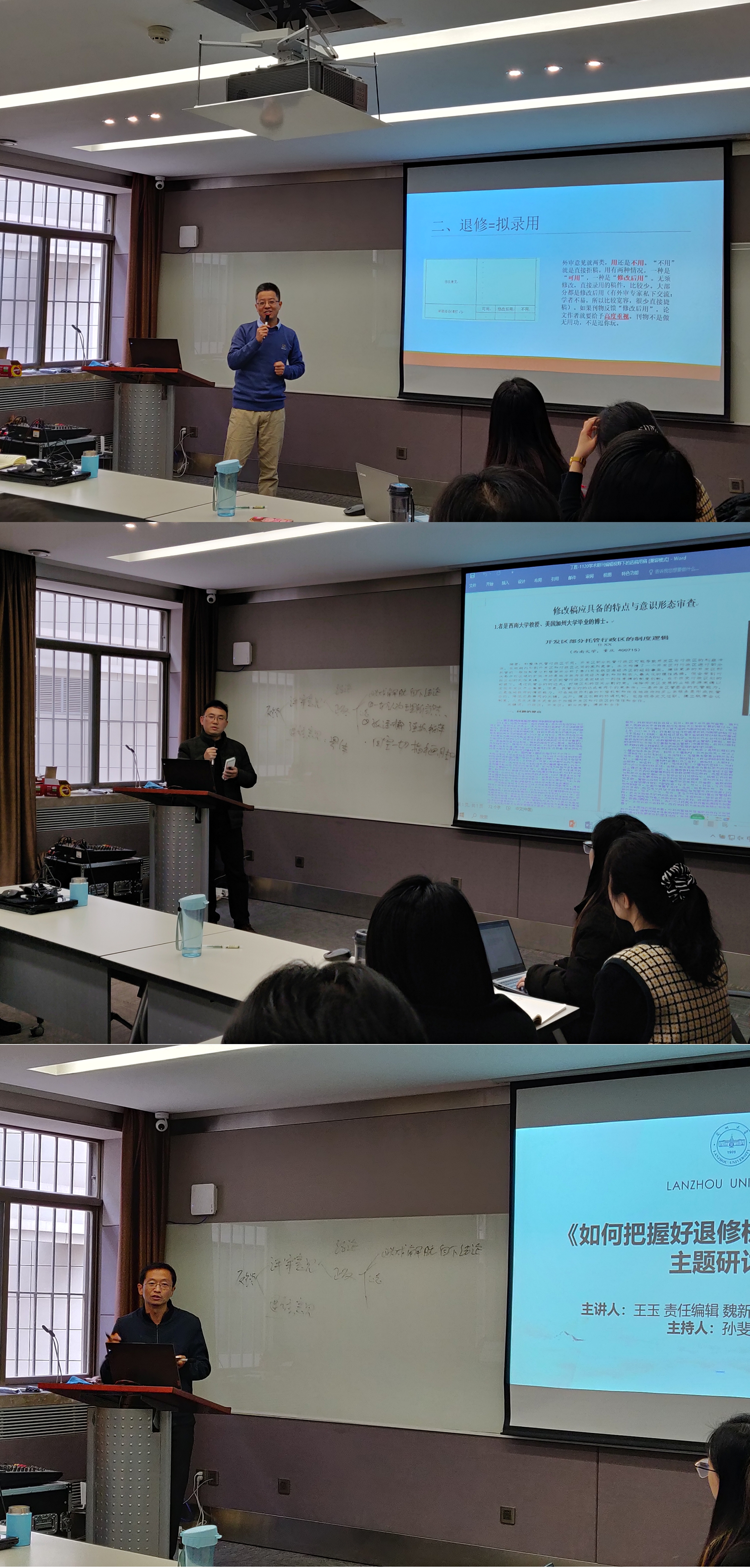 11月21日下午,应管理学院中国政府绩效管理研究中心孙斐副教授邀请,《上海行政学院学报》责任编辑王玉、《北京行政学院学报》责任编辑魏新、《贵州社会科学》副编审丁胜在城关校区西区齐云楼204会议室举行了“如何把握好退修机会实现逆袭”主题研讨会。管理学院高学德副教授、戴巍副教授、毛雪雯老师、王锐青年研究员和部分管理学院博士生、硕士生参与了此次研讨会。