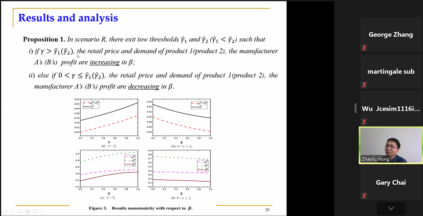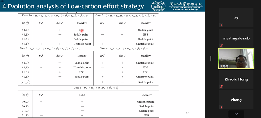 王冬冬博士研究生分享了题为“Evolutionary game analysis of low-carbon effort decisions in supply chain considering fairness concern”的报告。本研究关注有限理性及公平关切在供应链低碳投资策略中的作用,利用演化博弈模型讨论了制造商和零售商低碳努力的演化过程及相应的演化稳定策略,建立了考虑低碳供应链成员有限理性和公平关切的一个一般框架。分析表明,制造商和零售商在供应链中的地位会影响其低碳努力,较高的初始单位利润会促进低碳努力,而较低的初始单位利润则会对低碳努力产生负向影响。同时,有利的公平关切会增加中小企业的低碳努力,而不利的公平关切则会降低中小企业的低碳努力。此外,供应链企业对努力策略的选择也会影响他们的投资速度。