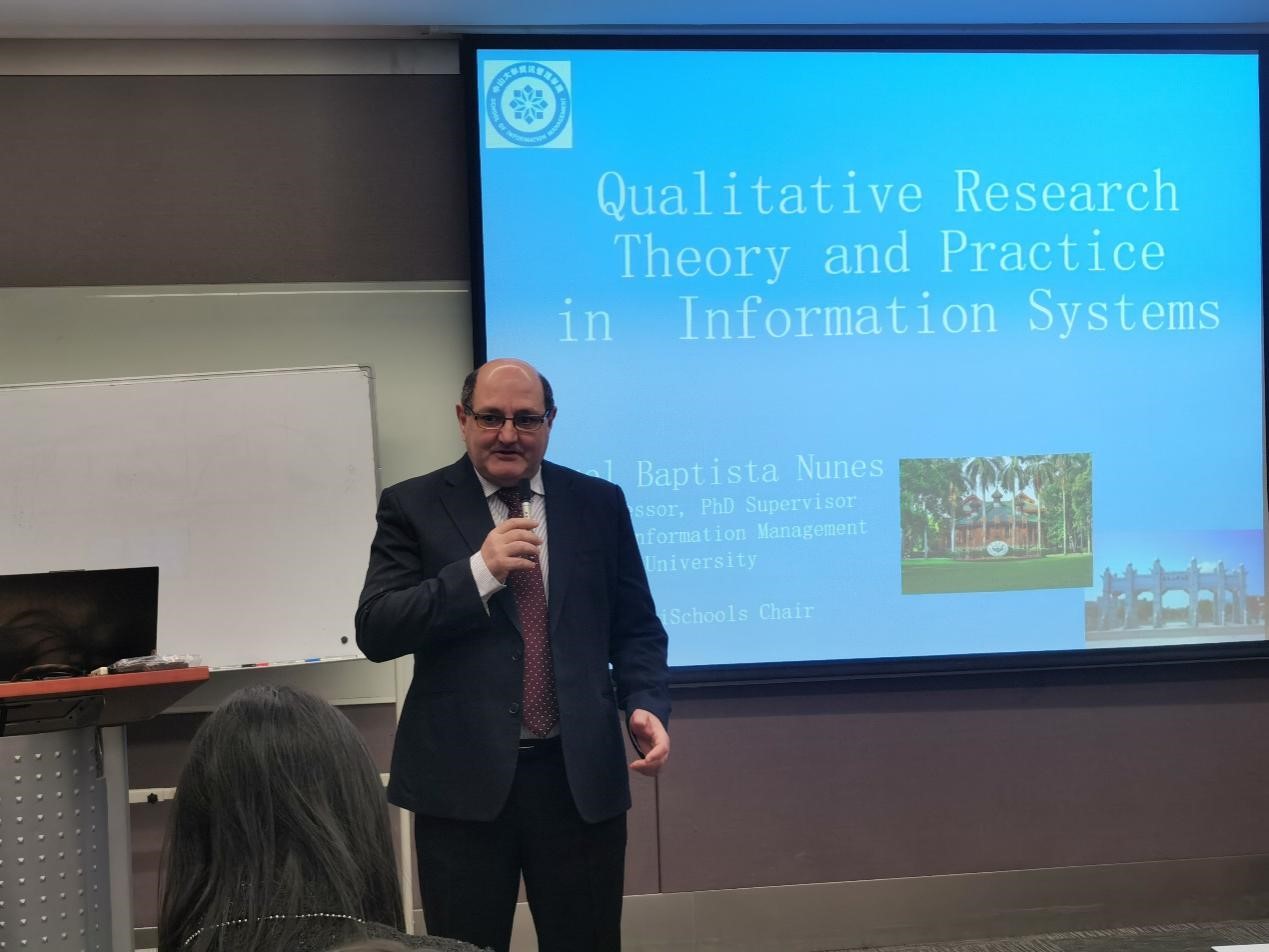 2020年12月4日上午,应管理学院王怀诗副教授邀请,英国高等教育协会会员、英国计算机协会会员、中山大学信息管理学院Miguel Nunes教授于齐云楼204会议室带来了主题为“Qualitative Research Theory and Practice in Information“的学术讲座,本次讲座由马婧副教授主持,危机信息管理研究所及校内外的多名师生参加了本次讲座和讨论会。