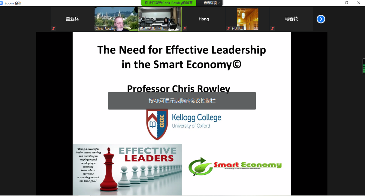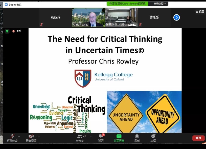 2020年12月9日下午,应兰州大学中国政府绩效管理研究中心保海旭副教授邀请,SSCI期刊Asia Pacific Business Review主编、牛津大学凯洛格学院和伦敦大学商学院Chris Rowley教授为我院师生开展了以“不确定时期需要批判性思考”、“智能经济时代对有效领导力的需求”为主题的两场线上讲座。讲座由张弘博士主持,中心和校内外的多名师生参加了本次讲座。