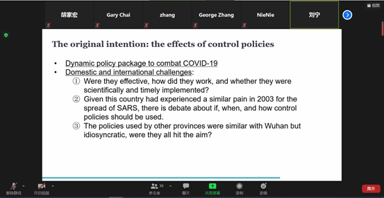 刘宁博士介绍了他的最新研究成果“Role of media coverage in mitigating COVID-19 ransmission: Evidence from China”。该研究通过对省级每日病例和密接人群数的分析,对今年1月以来新冠肺炎在中国的时空传播与地方政府的官方媒体报道情况进行建模,研究了新冠肺炎相关新闻媒体报道对人口流动、新冠病毒传播的影响。研究显示,媒体报道通过降低人口流动、增加防护等渠道在1月19日和2月29日间降低了约39万的新增病例和140万的密接人群。研究结果进一步体现了对密接人群进行追踪调查的作用,2月5日前密接人群数量和病例数量相关性更强,之后则由于检测能力的提高和公众行为的改变相关性变弱。随后,根据张哲老师、王康周老师的提问与交流,参会师生对该研究有了进一步的理解。