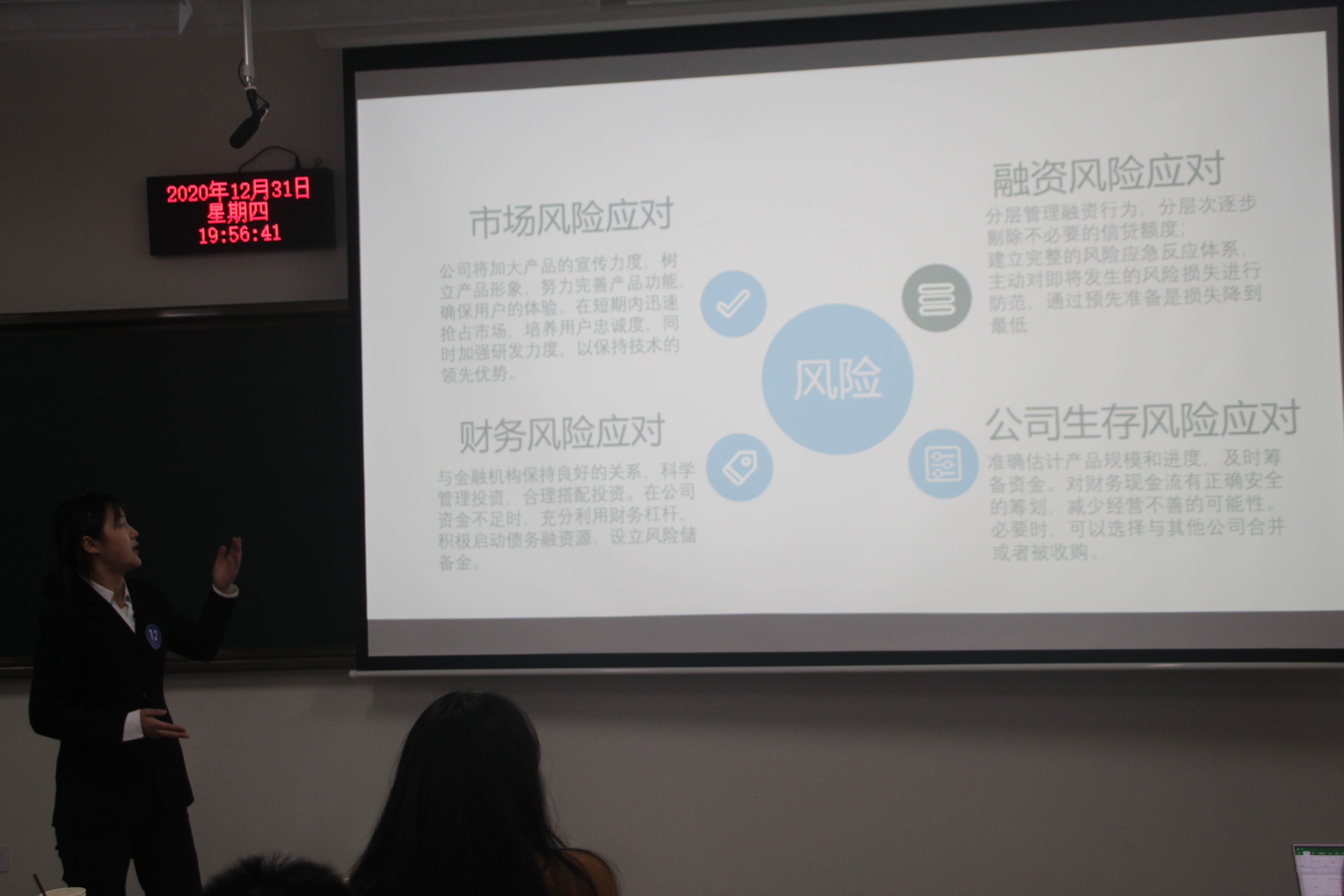 12月31日,兰州大学管理学院在榆中校区第二教学楼B201成功举办创意创业模拟路演活动。活动邀请融创立方加速器首席执行官李国梁博士,首席运营官晁媛媛女士,兰州大学会宁路双创示范街管理委员会主任、兰州大学国家大学科技园总经理邓毓博博士,兰州大学管理学院苑春副教授担任评委。2018级市场营销班和人力资源管理班全体同学参加路演并展示了各自团队的创业项目。
