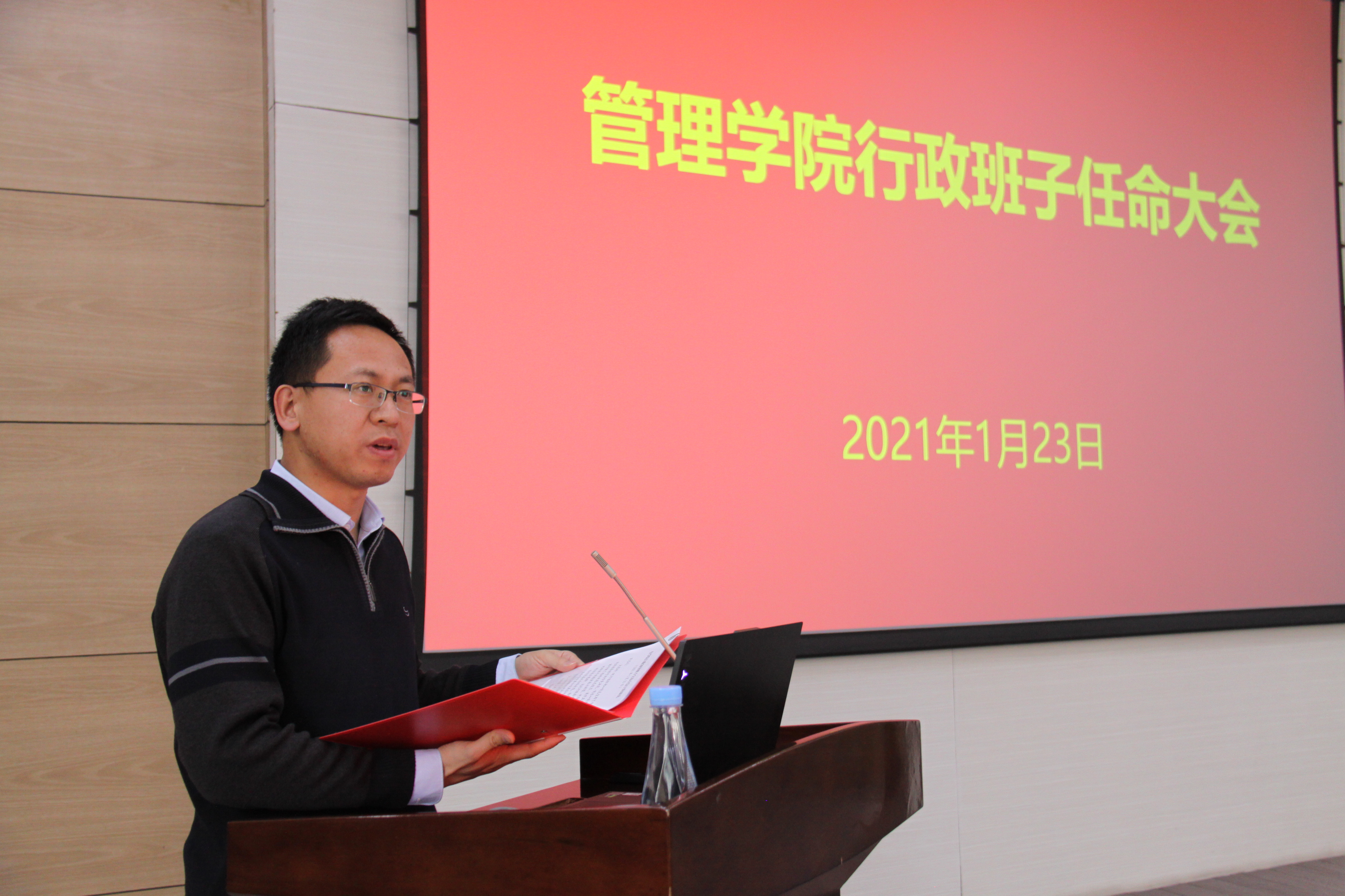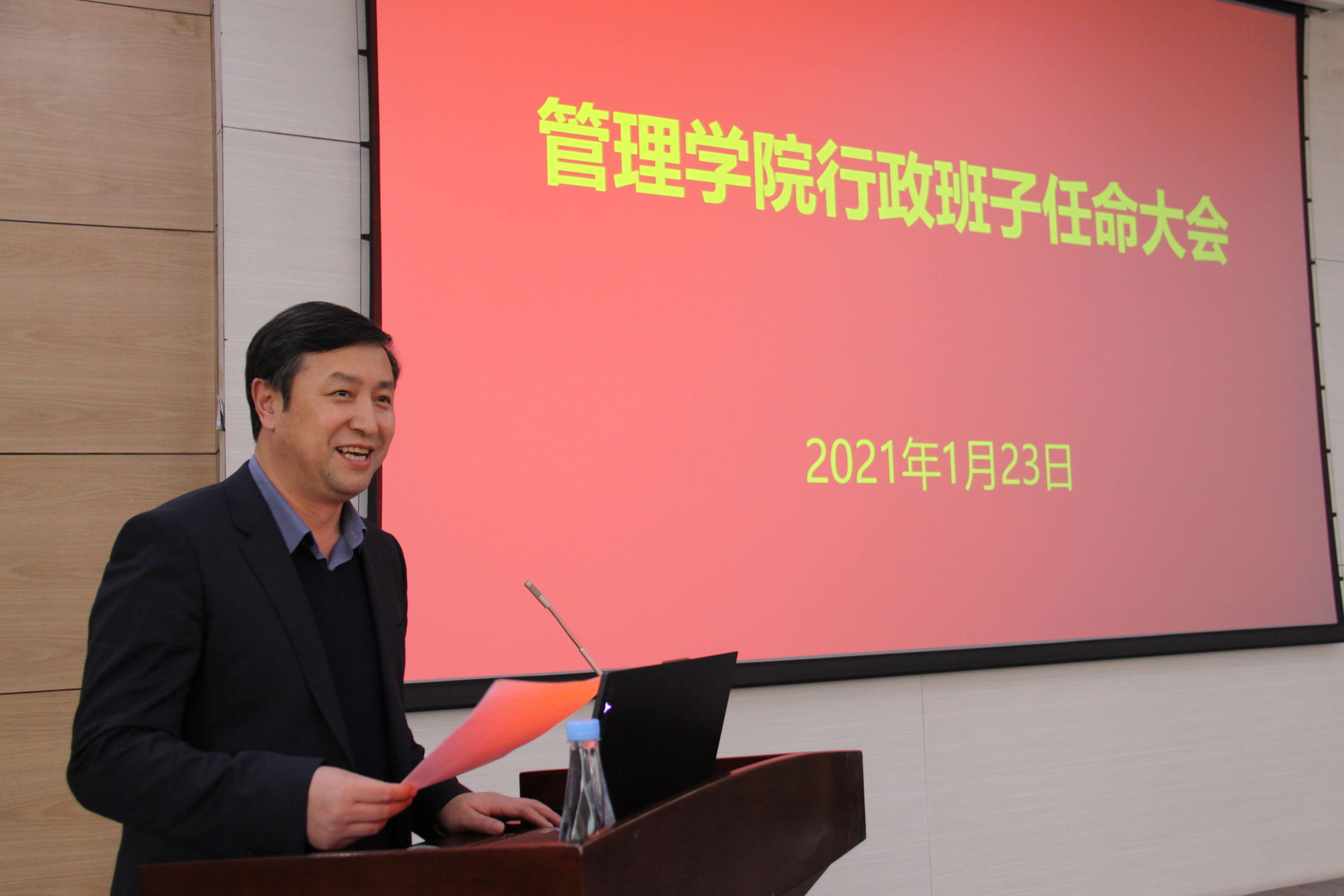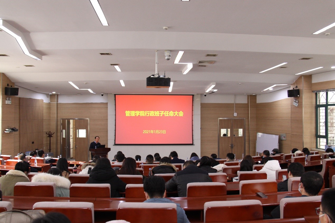 1月23日下午,学院在杏林楼第一报告厅召开全院教职工大会,校党委宣布学院新任行政领导班子。校党委常委、副校长沙勇忠出席会议,组织部副部长王西文,管理学院全体教职工参加了会议,会议由管理学院党委书记刘亚军主持。王西文宣布了学校党委干部任免文件,沙勇忠副校长代表学校讲话,院长何文盛教授做了表态发言。