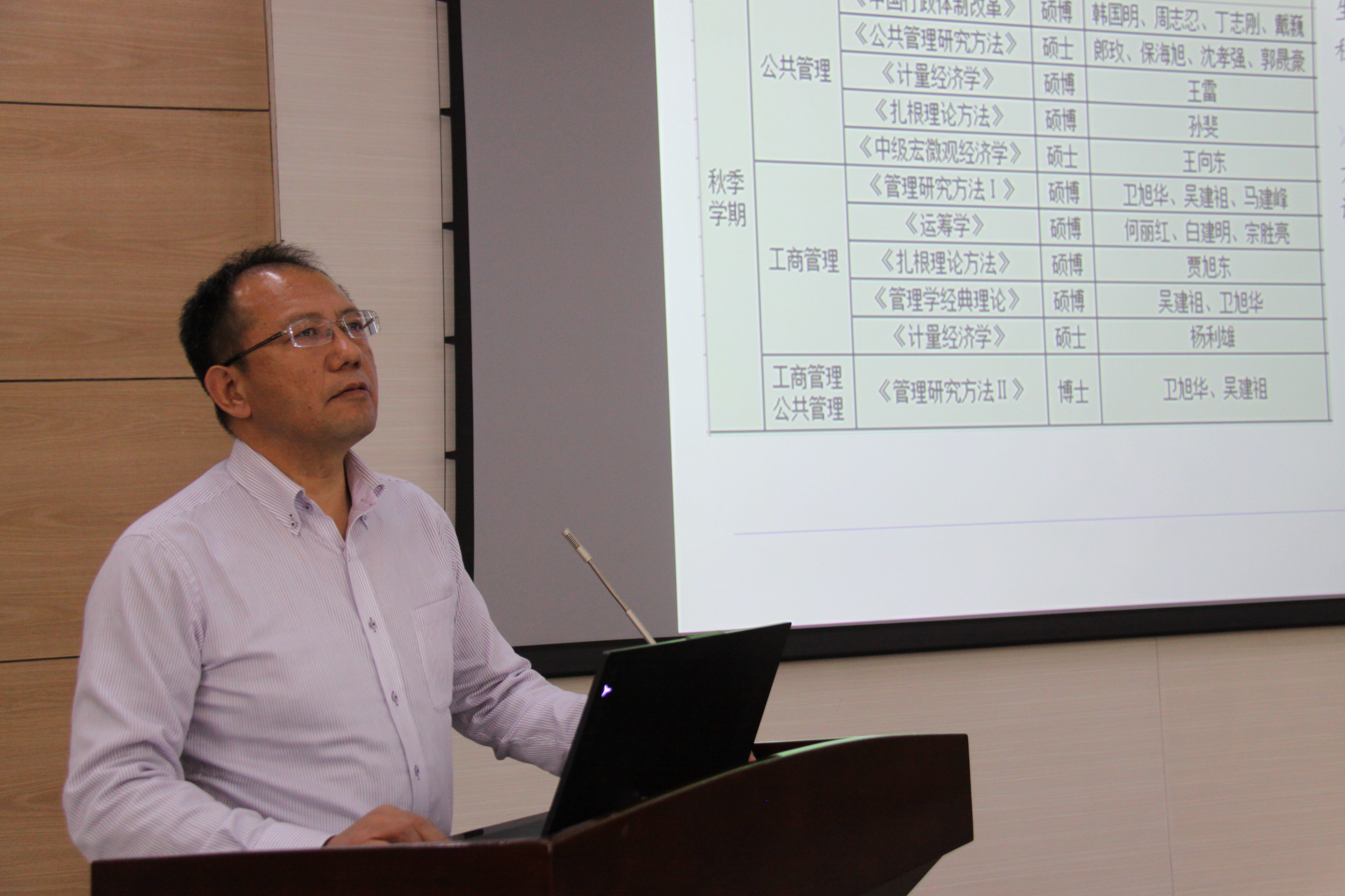 吴建祖副院长回顾总结了上学期学术型研究生工作以及科学研究工作,从学术型研究生招生、课程运行、学术周活动、学位论文和学位授予等方面对学术型研究生教育工作进行了通报,从科研项目、科研经费、论文与著作发表、获奖等方面通报了科学研究工作情况,并安排部署了本学期学术型研究生教育和科学研究工作。