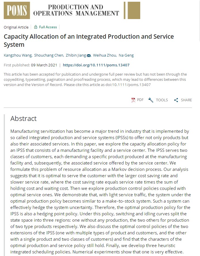 该研究成果近期以论文“Capacity Allocation of an Integrated Production and Service System”在商科领域国际顶级期刊Production and Operations Management发表。我院王康周教授为第一作者,兰州大学管理学院为第一署名单位,合作者包括上海交通大学江志斌教授和耿娜教授,浙江大学周伟华教授和陈寿长博士。Production and Operations Management 作为UTD 24系列期刊,是国际公认的商科国际顶级期刊,也是全球一流商学院研究能力的重要评估指标。该成果的发表,实现了管理学院及兰州大学专职教师在商科领域UTD 24国际顶级期刊成果发表的突破,标志着我校学者在制造与服务集成供应系统的能力管理研究领域跻身国际前沿水平。